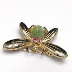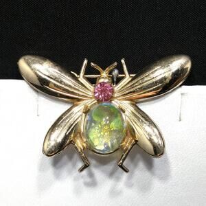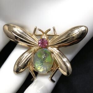 *Description: This is a beautiful Lucite winged insect brooch from the 1950s with a Lucite cabochon which has flakes of gold inside and a glass pink rhinestone head. The body changes its look as it moves in the light. This great vintage bug brooch would be a great addition to your vintage jewelry collection or make a great vintage gift!