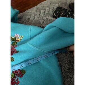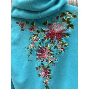 Vintage Lucky Brand Hoodie Y2K Turquoise Floral Embroidery Asian Art Sz M RARE