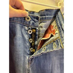 Vintage lucky brand jeans women’s size 12 measurements in photos. Button fly style is called easy rider Lightyear style number 7WD1202. These are wide leg. They have the button fly and the traditional lucky brand pocket liners. Super cool back pockets. Leather strap is missing on the back see photo Super soft nice worn washed denim overall great condition. There are some minor signs of where there’s a spot on the bottom right front leg see photo.