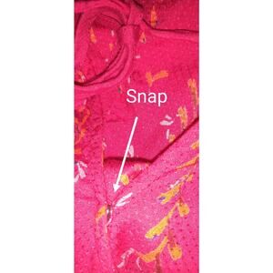 Previously Owned vintage Lucky Brand Floral Top. Burgundy/red color with floral designs. Long sleeves, pullover to wear, there are drawstrings in front to tie. Crosses over in front and snaps at top. I am not sure why there is that seam under front, not sure if there used to be stretchy elastic there where it may have been a blouson top, but the seam does not go around to the back. If it was elastic, it no longer stretches, but it is a very cute top. Lightweight.
