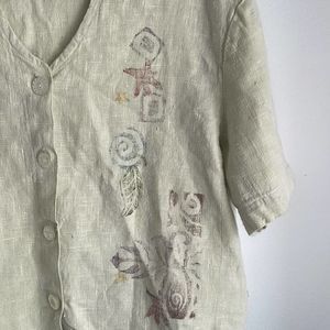 Vintage Lucy & Ezzy V neck linen boho cottagecore lagenlook paint stamped top