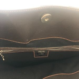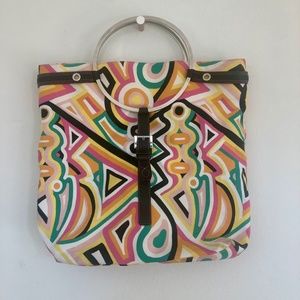 Super unique with a chic graphic print bag. Canvas material with leather trim + metal grips. 11”x13”x4.5” Vintage Preloved great condition.