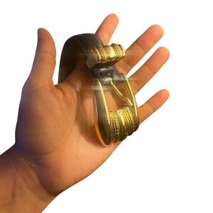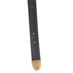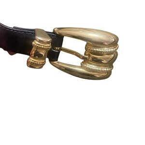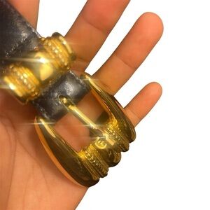 Elegant black leather belt featuring a gold and silver buckle. Perfect for adding a touch of sophistication to any outfit.