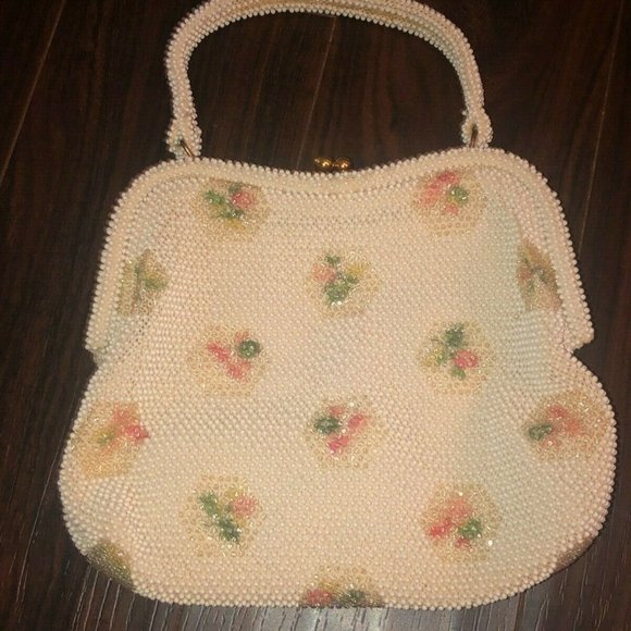 Vintage Lumured Petite Bead purse with matching mini purse and original mirror. There is a few missing beads at the top and discoloration due to age.