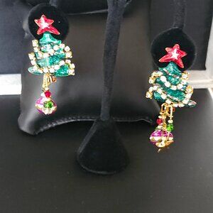 Festive Christmas tree earrings, decorated with green, red and purple enamel, and further adorned with rhinestone garland, 3 dangling crystals and ornaments, and topped with a red enamel star. Post backs for pierced ears.