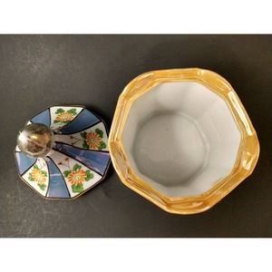 Vintage Lusterware Covered Candy Dish Peach Blue Gold Ceramic Porcelain Painted