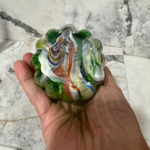 Green glass with multicolored swirls, scalloped design beautiful bright green with swirls of white, yellow orange, and blue. One of a kind, truly a stunning piece. No chips or cracks, exceptional vintage condition, handmade, hand blown art glass.