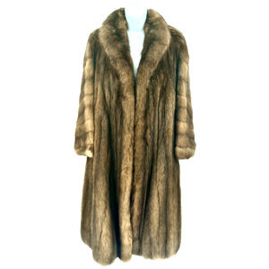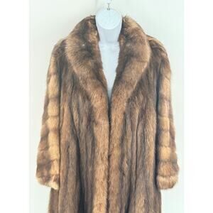 This vintage luxury full length Russian crown sable fur coat is a genuine natural brown outerwear piece for women in size medium. The coat features a classic full length style and is crafted from high-quality fur, making it a luxurious and stylish addition to any wardrobe. With its timeless design and premium material, this coat exudes sophistication and elegance, perfect for those looking to make a statement with their outerwear.