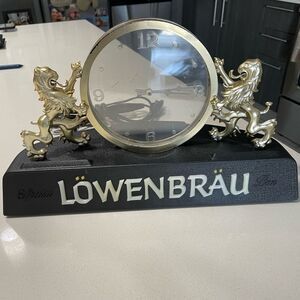 Vintage, Löwenbräu, Beer clock, German brewery, Promotional item, Barware, Man cave decor, Lions, Gold tone, Mantel clock, Desk clock, Collectible, Beer memorabilia, Vintage advertising, German beer, Brewery collectible, Bar decor, Retro, Munich beer, Ornate, Decorative, Timepiece, Home decor, Kitchen decor