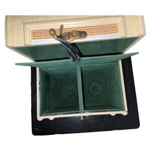 This vintage decorative storage box features an intricate cracked texture and a classic Greek olive oil label. Its sturdy design makes it a stylish yet functional addition to any space. With a plush green interior and secure clasp, it is ideal for storing personal items.