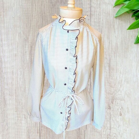 Lovely vintage blouse. Ruffle collar and front placket. Windowpane pattern. Thin fabric belt at the waist.