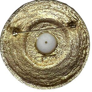 Striking vintage brooch signed GM JENT, featuring a domed faux pearl cabochon surrounded by a richly textured gold-tone medallion. The concentric layers of Greek key patterning and hammered finish evoke a glamorous 1980s aesthetic, perfect for power dressing or modern retro styling. A rare and collectible statement piece.