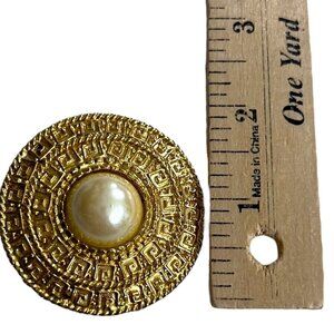 Vintage M JENT Gold Medallion Brooch Faux Pearl & Greek Key Design MCM Pin