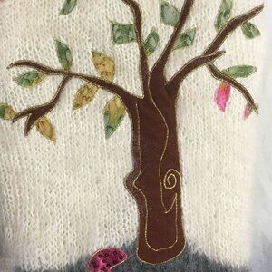Pockets, ribbed neck, sleeve cuffs and hem, button front with extra buttons, super shaggy kid mohair and wool blend, fully lined, tree and mushroom appliques, allover design, shoulder pads. Tagged medium but will fit a large as well. Vintage brand is Norwegian Design Bergin Norway. True art to wear.
