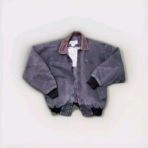 This vintage M.A. Klein Blanket Lined Jacket in gray canvas is perfect for any stylish biker or workwear enthusiast. The jacket features a spread collar, zipper closure, and accents such as a logo and zipper details. It is made of durable cotton and has a polyester lining and insulation material for added warmth during the winter, fall, and spring seasons.
