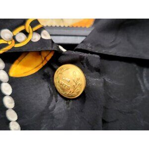 So much going on with the blouse but it's very feminine & subdued at the same time. The obvious all-over print features pocket watches, gold chain links & strands of pearls. Behind that is a tnal black floral brocade. I tried showing that in a few of the up close photos - please review.