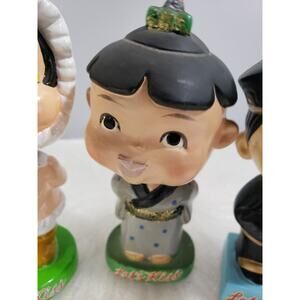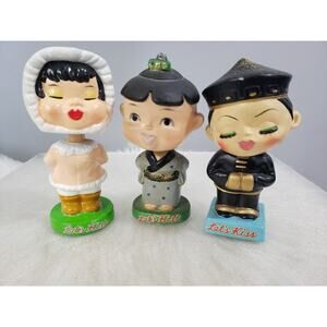 Very cute collection of three true vintage handmade paper made bobble heads. They have magnets in their lips to make them kiss. Set is in used condition - some scuffs and scratches, cracks, paint loss throughout - see pictures. One of the Asian bobbles heads doesn't "float" anymore and rests on its shoulders. Set displays beautifully and meets an eclectic mix of home decor styles.