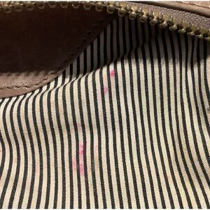 Vintage Distressed brown leather wristlet with matching jewels and brass/gold hardware. Inside has a couple red ink stains as shown. 9” X 5”.Good condition.