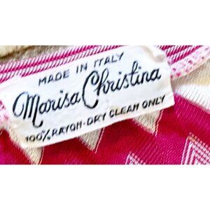 Very pretty vintage top by Marisa Christina. Circa 70s / 80s. Pullover style. V neck. Pink and white zig zag pattern. 100% rayon. Made in Italy. Small hole in the arm (see photo). No size tag. Listed as a size small based on measurements (see size diagram in photo section). Overall really nice pre-owned vintage condition!