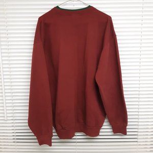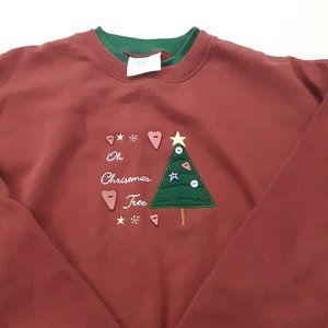 Here is a vintage mc energy sportswear holiday sweatshirt in a dark burgundy/embroidered with the spellout of of oh christmas tree in white the size of this Is large the thing with this is on the christmas tree on the bottom left corner there was a button but got lost but other than that this sweatshirt is still in good condition and wearable. Measurements:top/bottom(27.5)chest:(23)sleeve(31.5)