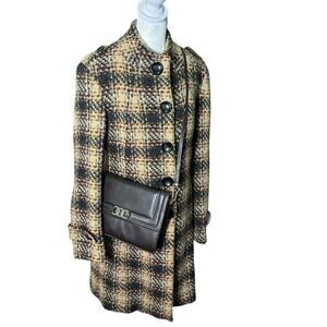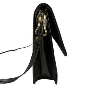 Purse is in really nice shape. Minor signs of wear including scuffs and/or scratches on leather. My best guess is this handbag is from the 1970's if not early 1980s. The leather exterior is a deep brown with gold tone hardware. Interesting plastic and metal snap closure and spring back attachment for strap that is removable.