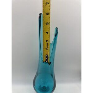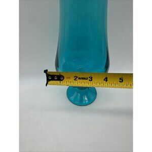The product is a vintage 16.25" LE Smith Simplicity peacock blue fat bottom swung vase, featuring a Mid-Century Modern style. Made of glass, this decorative vase showcases a beautiful blue color and a unique peacock design, adding a touch of elegance to any space. The fat bottom design gives it a distinctive and collectible appeal, making it a standout piece for pottery and glass collectors.