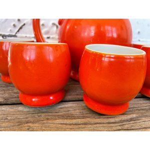 Vintage MCM 1960s Ceramic Orange Ball Pitcher With 5 Glasses set