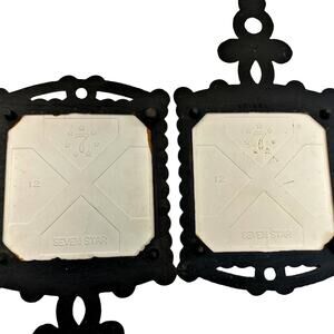 NOTE: Both show signs of age. The cast iron holders have light rust and the tiles have a few light scratches on them although not really noticeable. No cracks.