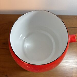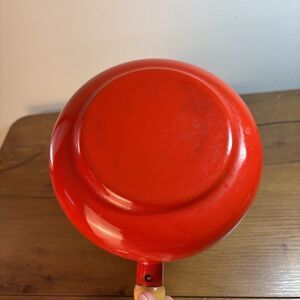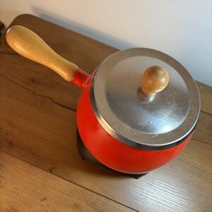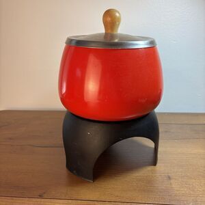 Vintage MCM 70's Red Fondue Pot and Stand Wooden Handle