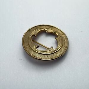 A beautiful and sophisticated Mid-Century Modern abstract brooch. While unsigned, this piece is a documented and confirmed design by a major American costume jewelry house celebrated for its "simple, modern, and often sculptural metalwork in gold and silver tones". It is an exact match to signed examples from the 1960s. The design features a fine cross-hatch texture and a stylized, openwork floral center. Its high-quality gold plating is in exceptional condition. A perfect, elegant example of 1960s minimalist design.