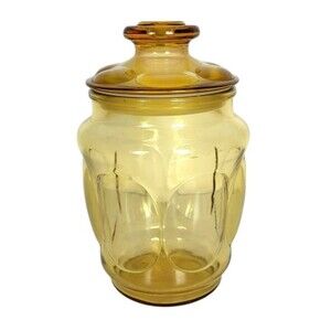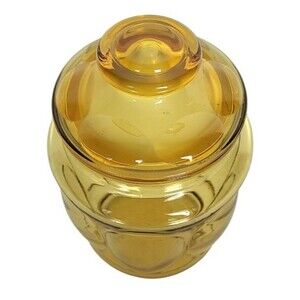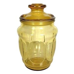 keywords: vintage, MCM, amber, gold, glass, thumbprint, moon and stars, mid century glass, apothecary, candy jar, food storage, rare, hard to find,