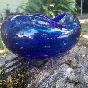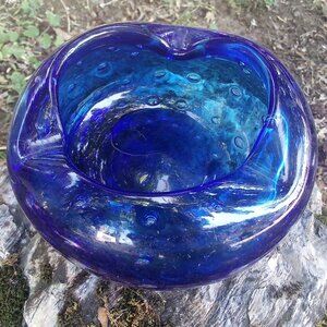 Vintage MCM Art Bubble Glass Ashtray Trinket Blue Cobalt