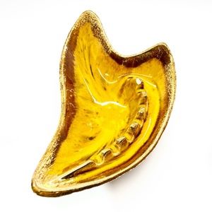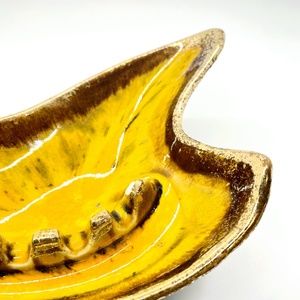 Beautiful, atomic style drip glaze ashtray by Cal Style USA with gold detailing. Marked Cal Style 2917 USA. Ceramic. Small chip as shown in photo. Measures approximately 8" x 5"