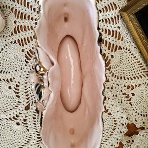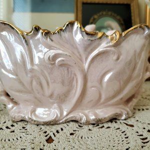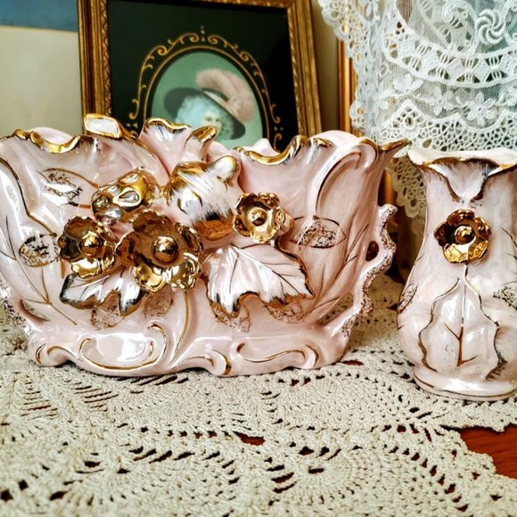 It's unusual to see the set remain together. This classic Pink and Gold (so VERY 50's) set is in excellent condition, with no chips, cracks or scratches. The planter has no staining from use, as it was used as a decorative piece only.