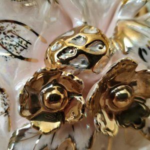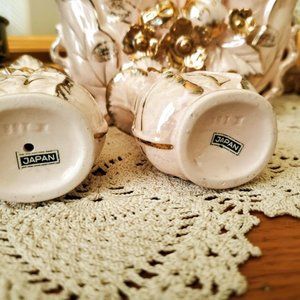 A gorgeous Mid Century set from Benson Pottery. This pink luster glazed set has beautiful gold flowers with a strawberry and leaves applied to the front,, with hand painted gold accents all over the piece.