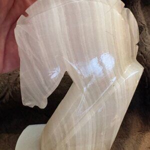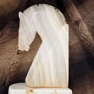 Absolutely exquisite, mid-century modern carved natural stone (likely marble, onyx, or alabaster) horse head, knight chess bookend. In neutral shades of white/cream, the striations in the natural stone are gorgeous. Use it as a bookend, or a super cool accent piece anywhere you want vintage vibes! In excellent vintage condition, with no visible chips, cracks or damage, it measures 7 1/2 inches tall x 3 inches wide at the base. Feel free to ask questions, and enjoy!