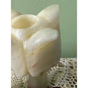 Enhance your home decor with these exquisite vintage MCM carved onyx flower candle stick holders, perfect for adding a touch of elegance and sophistication. These measure 6.5" tall . One tip of the flower seems to be carved flat and not with a point. A couple of tips have some tiny nicks. The flaws are not noticeable and these display well.
