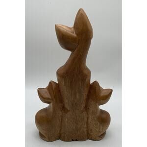 This vintage wooden sculpture features a charming cat trio, including a mom cat and two babies. The intricate carving of the wood gives this piece a unique and timeless quality. Perfect for any cat lover, this mid-century modern cat sculpture would make a great addition to any collection or a standalone decorative piece.