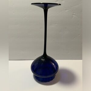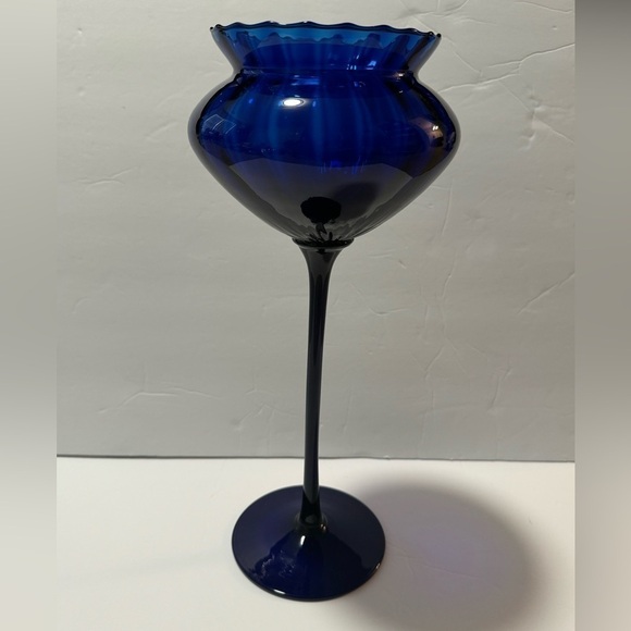Gorgeous Vintage MCM Cobalt Blue Stretch Tall Pedestal Hand Blown Bowl with Scalloped Rim. Measures approximately 16”x7”x7”. In good condition. No chips or cracks.
