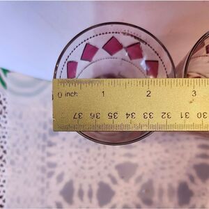 This gorgeous set features clear glasses with beautiful pink diamonds surrounded by 22-karat gold scrolling, giving it a very elegant "Hollywood Regency" look