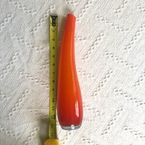 ๐ Vivid orange cased glass bud vase with white interior; sculptural slanted lip, mid-century modern style (likely 1960sโ70s Italian Empoli), but piece is unmarked and can't be verified.