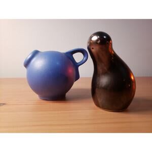 Lovely iridescent copper and blue ceramic salt and pepper shakers made by Red Wing Pottery in the 40's-50's as part of their Town and Country line. Designed by Eva Zeisel, these are referred to by collectors as a Shmoo shaker, the blue shaker is part of town and country line by Eva Zeisel but not of the Shmoo design. They are 2.5" and 3" tall, Shmoo has the original cork, the Blue one is missing it's cork. Both are in excellent condition - no chips, cracks or repairs.