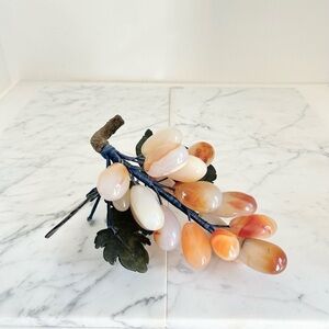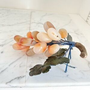 Vintage mid century polished stone grape cluster. Beautiful carved agate grapes. The grapes vary in size and shape as well as in the different color inclusions in the milky clear and reddish orange stones. The 5 green leaves are carved stone as well with some carved lines for detail and the end stem looks quite realistic. Nice vintage condition showing minimal wear