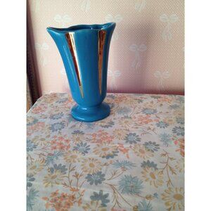 Add timeless elegance to your decor with this vintage blue ceramic vase. Its gold-accented stripes and scalloped rim create a striking visual appeal. Ideal as a centerpiece, it enhances both contemporary and classic interiors with its unique charm and vibrant coloring. A perfect blend of artistry and functionality.