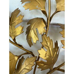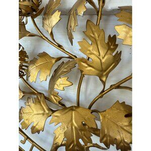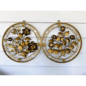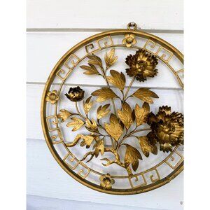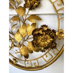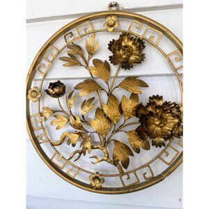 Vintage MCM Gold Metal Asian Flower Round Wall Plaques