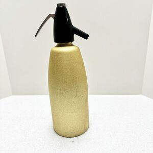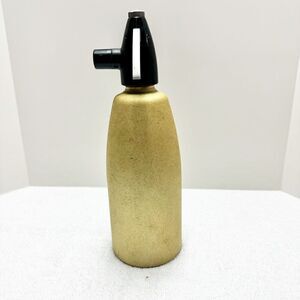 Vintage mid century modern soda siphon in textured gold with black spout. Excellent condition. Has not been tested but all parts look intact. There is some minor wear to be expected from an antique piece, but nothing major. No dents. Size is approximately 10” tall by 4” across.