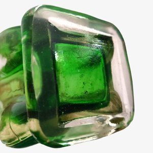 Green flower frenzy with fingers! Chunky but beautiful vase stretches upwards w an open five finger mouth. Perhaps a cross between a flower stem & a hungry baby bird? Many skills were used to create this babe, she is hand blown, twisted, stretched & swung. All that in two colors! Sparkly bubbles throughout.