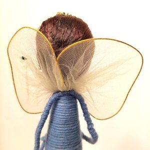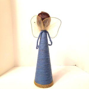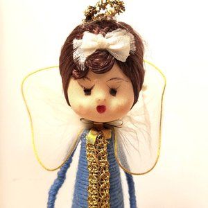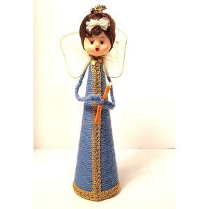 A vintage MCM hand-crafted Christmas Angel from the 1960s, uniquely made from yarn and adorned with a brocade trim. Its blue and gold colors add a classic touch to any holiday decor.