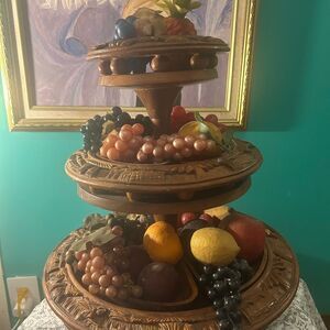 Elegant wooden tiered stand. Features realistic multicolor fruit accents. Perfect for adding a vintage touch to any room.