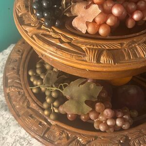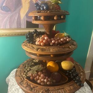 Vintage MCM Handcarved Wood Tiered Lazy Susan Faux Fruit 60s